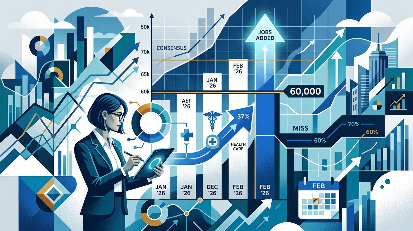 Consensus forecasts sit between 65k and 80k, yet the market prices a miss at 59%. With health care adding 124k alone in January, the floor is higher than traders think.
