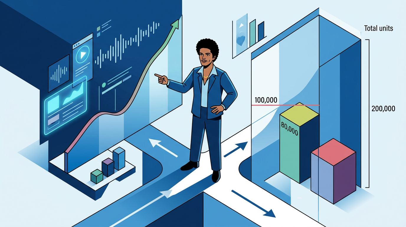With 'Risk It All' topping Spotify, Bruno is winning the streaming war, but early projections of 200k total units imply his pure sales will land closer to 80k than the 100k needed for a payout.