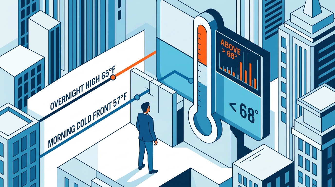 Despite a deceptive 65°F overnight high, a morning cold front dropped Central Park to 57°F by sunrise, creating a massive 11-degree hurdle for the temperature to breach the 68°F threshold.