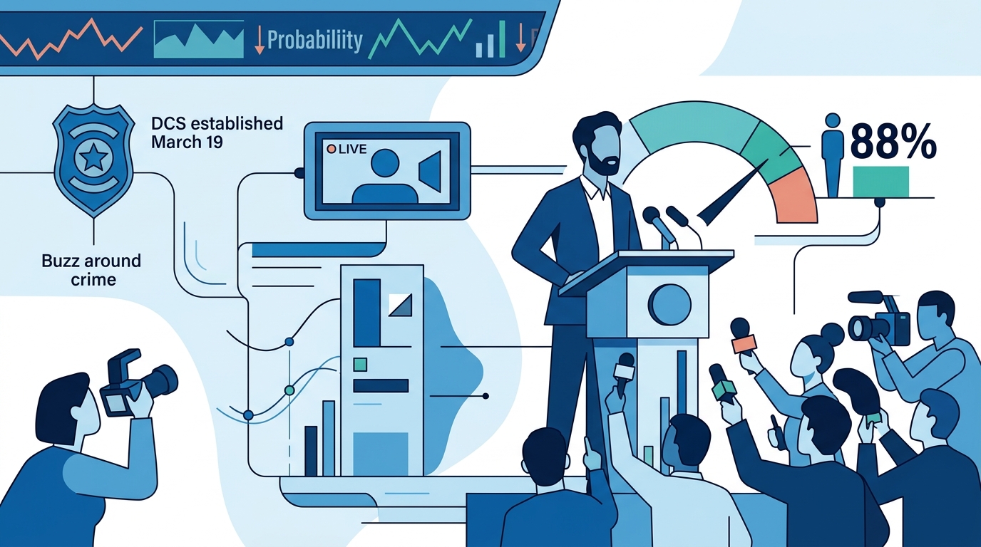 With his signature Department of Community Safety established on March 19 and a press corps eager to ask about crime, Mayor Mamdani has an 88% chance of dropping the S-word in his next livestream.