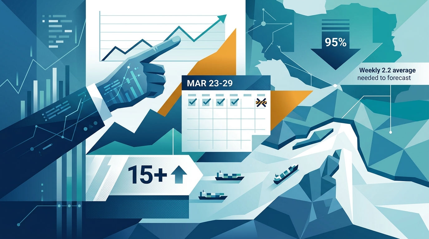 Despite a 95% collapse in traffic and a late-week blockade, the Strait only needs 2.2 ships per day to hit this target—a pace easily cleared early in the week.