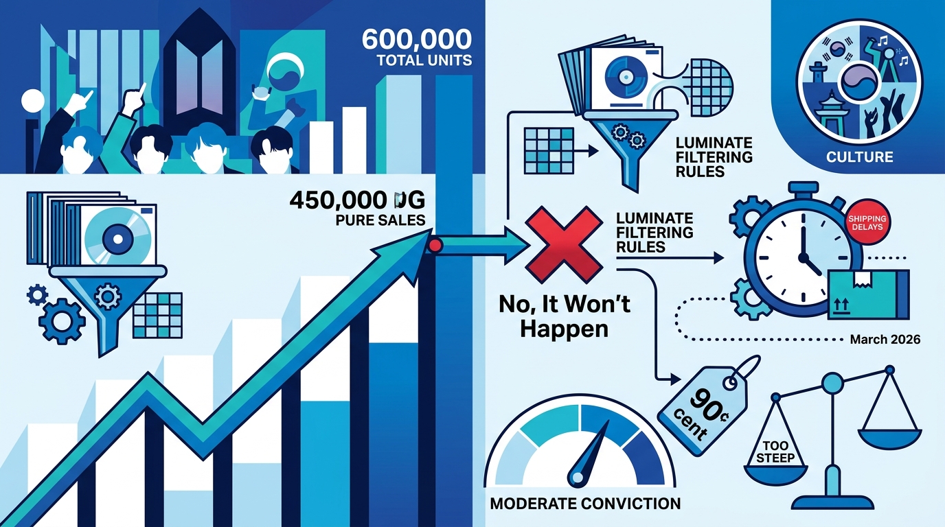 While BTS's reunion album is tracking toward a massive 600,000 total units, strict Luminate filtering rules and shipping delays make the 90-cent price tag on 450,000 pure sales too steep.