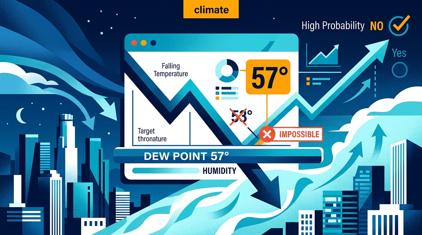 With the Los Angeles dew point sitting at a sticky 57 degrees just hours before sunrise, a drop below 53 degrees is meteorologically impossible without a sudden air mass change.