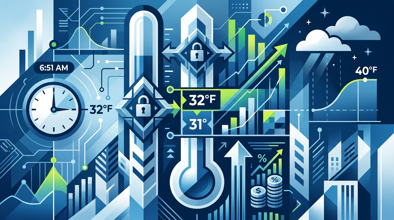 With the NWS already reporting a 32°F low at 6:51 AM and evening temperatures forecast to stay near 40°F, the 31-32°F bin is currently the heavy favorite to hold through midnight.