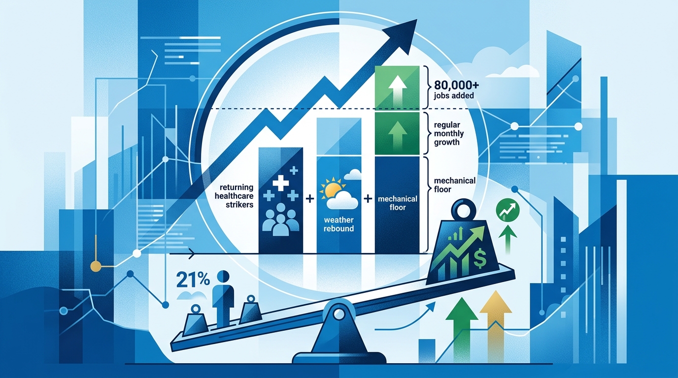 A guaranteed 30,000-job boost from returning healthcare strikers and a 38,000-job weather rebound sets a massive mechanical floor, making the 21% market price a severe underreaction.