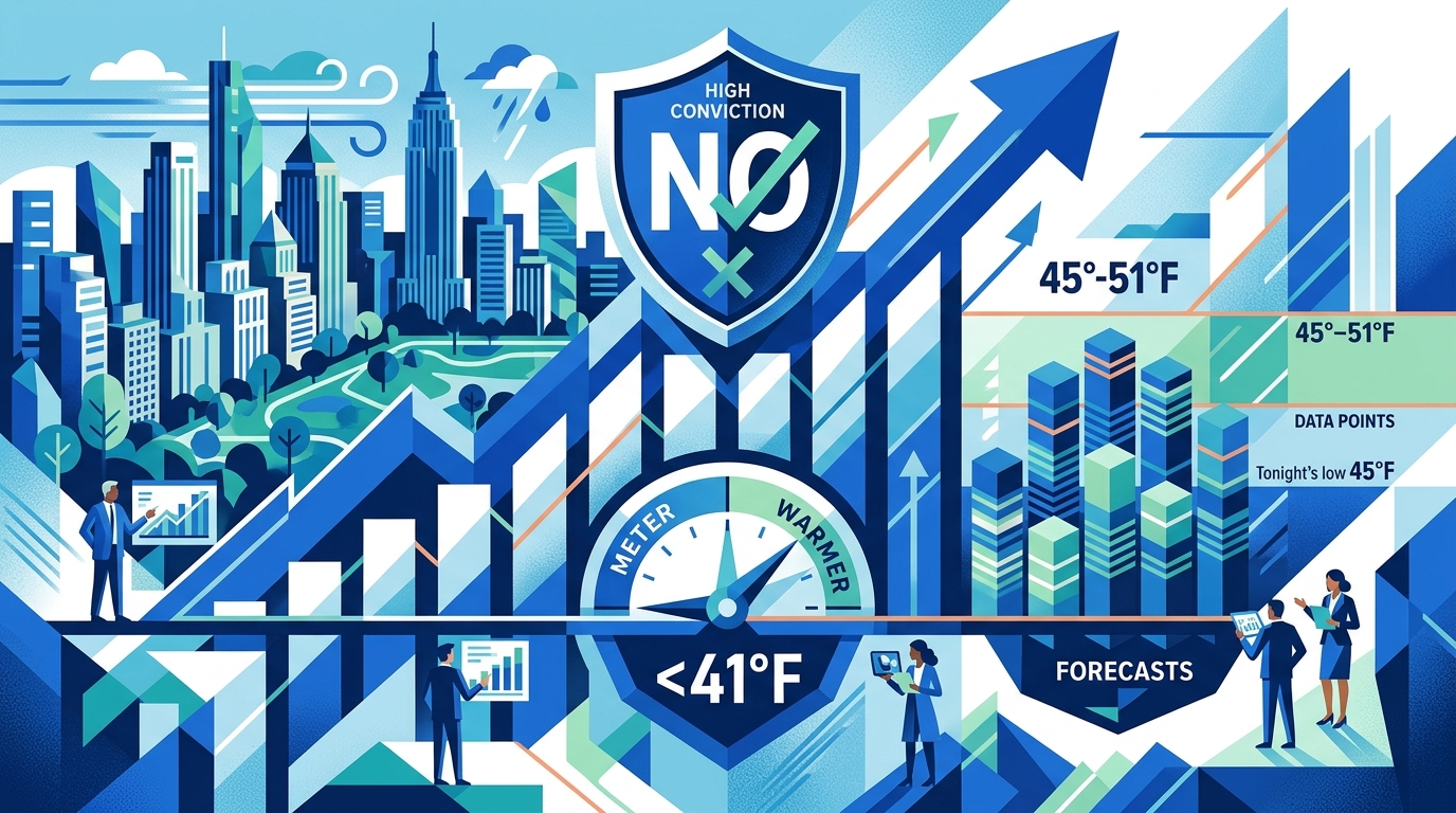 With Central Park temperatures holding at 45°F to 51°F this morning and tonight's low forecasted at 45°F, a drop below 41°F before midnight would require a meteorological miracle.