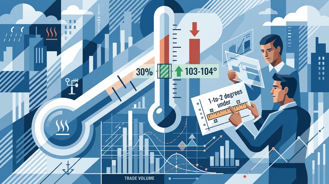 With the official NWS forecast calling for 105 degrees, betting on the 103-104 degree bin requires the historic heatwave to underperform expectations by a precise 1-to-2 degree margin.