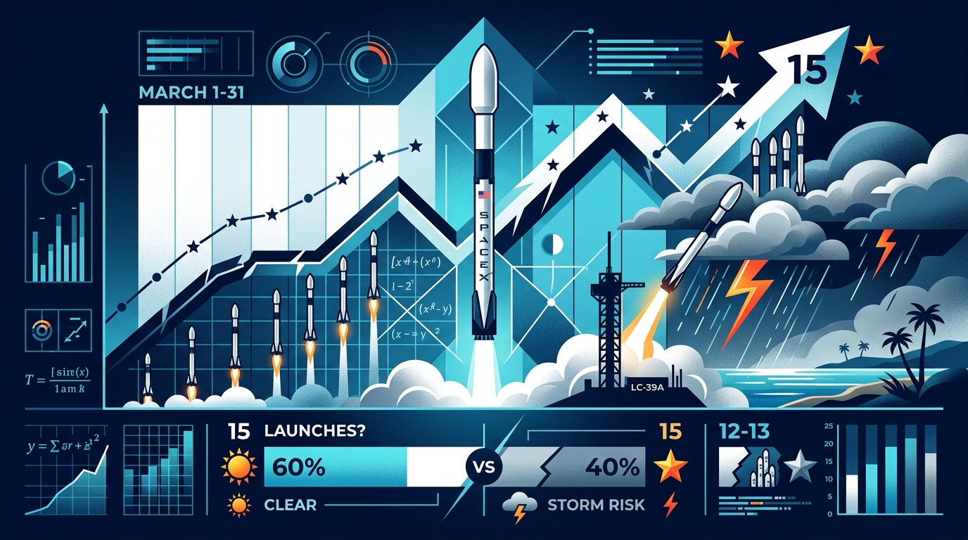SpaceX must nearly double its daily launch rate to 0.7 missions per day for the rest of March to hit 15, a feat currently threatened by a 40% chance of Florida storms.