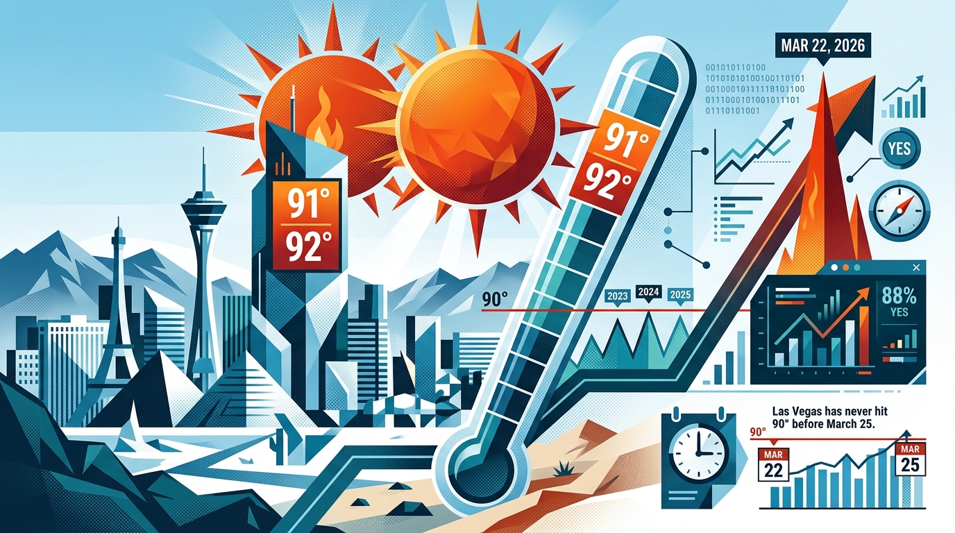 Las Vegas has never recorded a 90-degree day before March 25, making today's 91-92 degree target bin an extreme historical outlier.