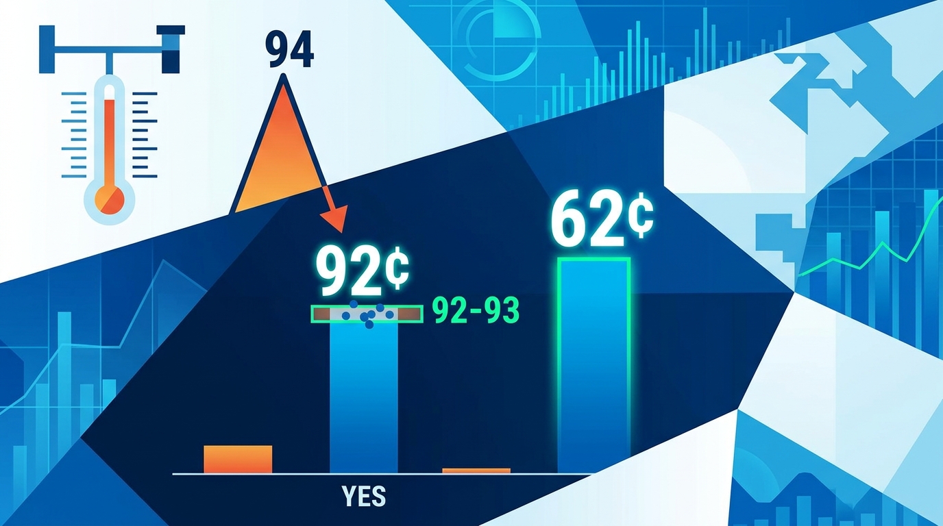 The official NWS forecast for Austin today is 94 degrees, sitting above this market's narrow target bin and making the 62-cent YES price a statistical anomaly.